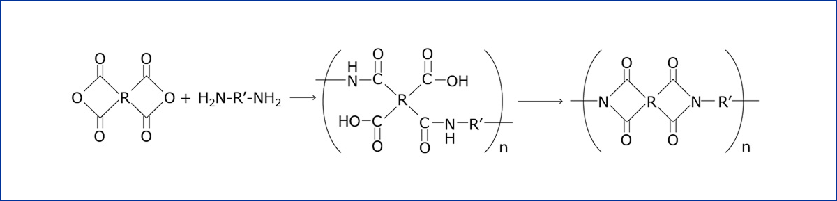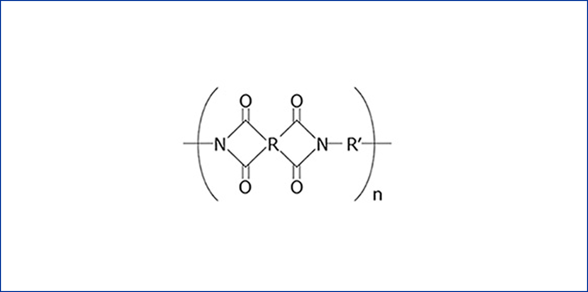 - ポリイミド(Polyimide:PIと略)は分子鎖内にイミド環結合(図1)を含む高分子化合物です。このRが芳香族となる芳香族ポリイミドが工業的に多く利用されています。